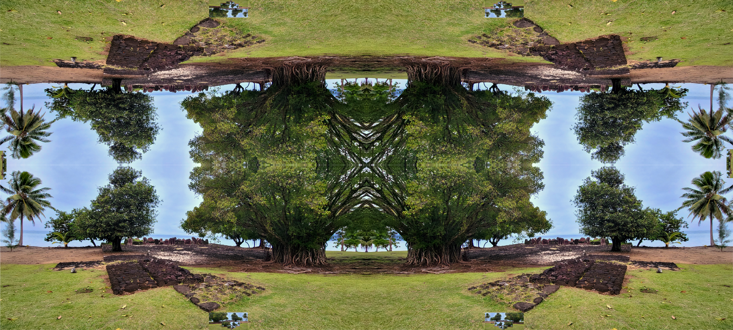 At top is the kōhatu placed on Taputapuātea under the guidance of Tihoti (it was bound by Kim Kahu). In the middle photograph is one of eight marae on the site: Hititai, the marae where rahui (restrictions on behaviour due to certain prior events) would be placed. Hititai is located adjacent to a Bunyan tree, which has special relevance to Moana peoples. The lower image shows the main marae at centre, above it is Hauviri (the marae for the investiture of the Tamatoa dynasty), and at top right on the edge of the sea is Opu-teina, the navigator marae. This link takes you to more on the project.