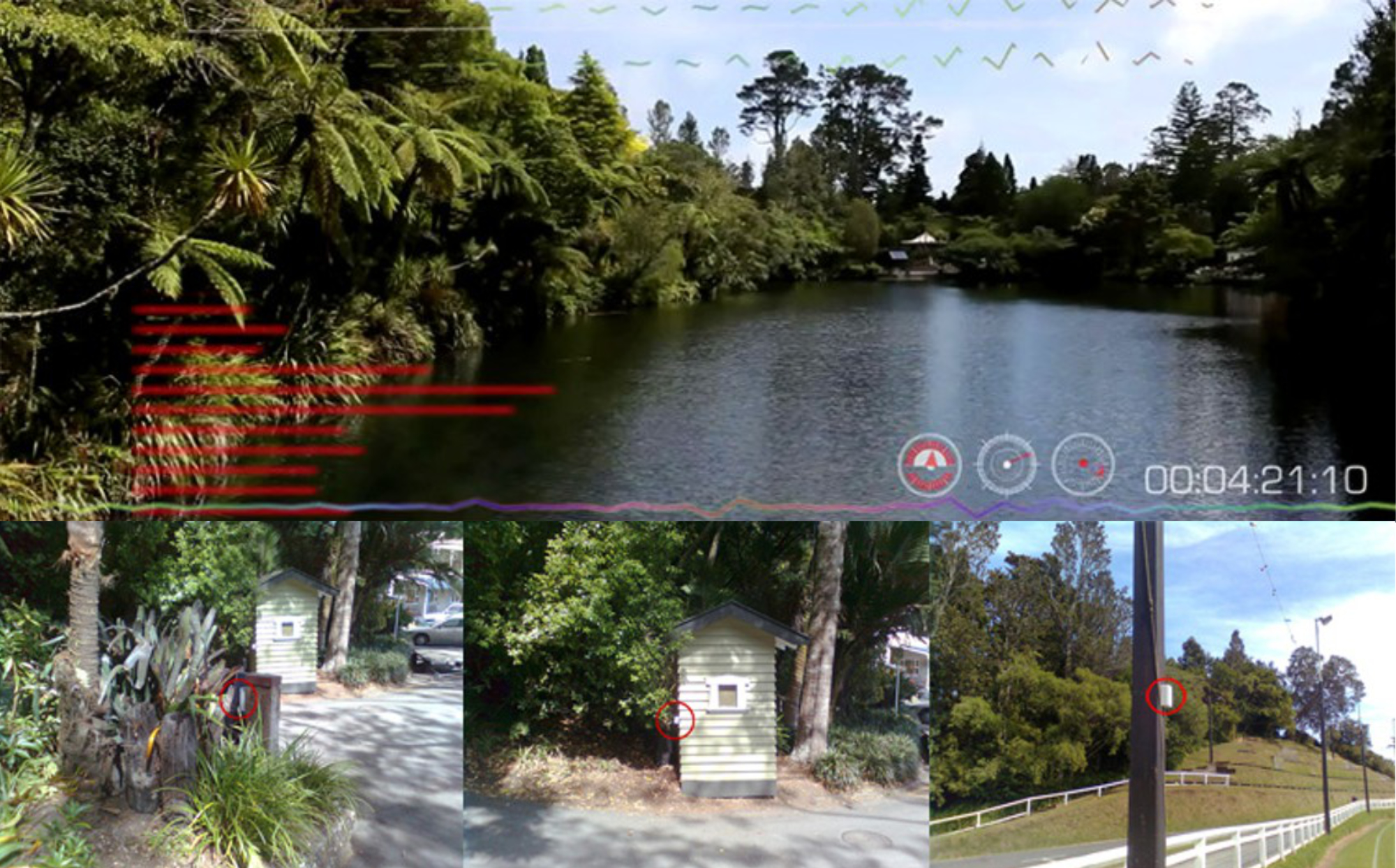 Some of my projects have been an exploration of the capacities of technology to provide meaningful experiences for the audience, in particular reframing our understanding of nature. The Park Speaks was a collaboration with Julian Priest, Andrew Hornblow and Adrian Soundy. Live environmental data – temperature, UV and people count (lower image) determined which of 140 audio files played in the installation, to accompany a dual desktop data projection in Puke Ariki (upper image – a 360° pan of the lake in Pukekura Park, lines and dials represent data orientated audio). This project also utilised the idea of a small-scale integrated system – interconnected. Commissioned by Puke Ariki, later iterations of the same system included an Indigenous cultural origin of the audio.