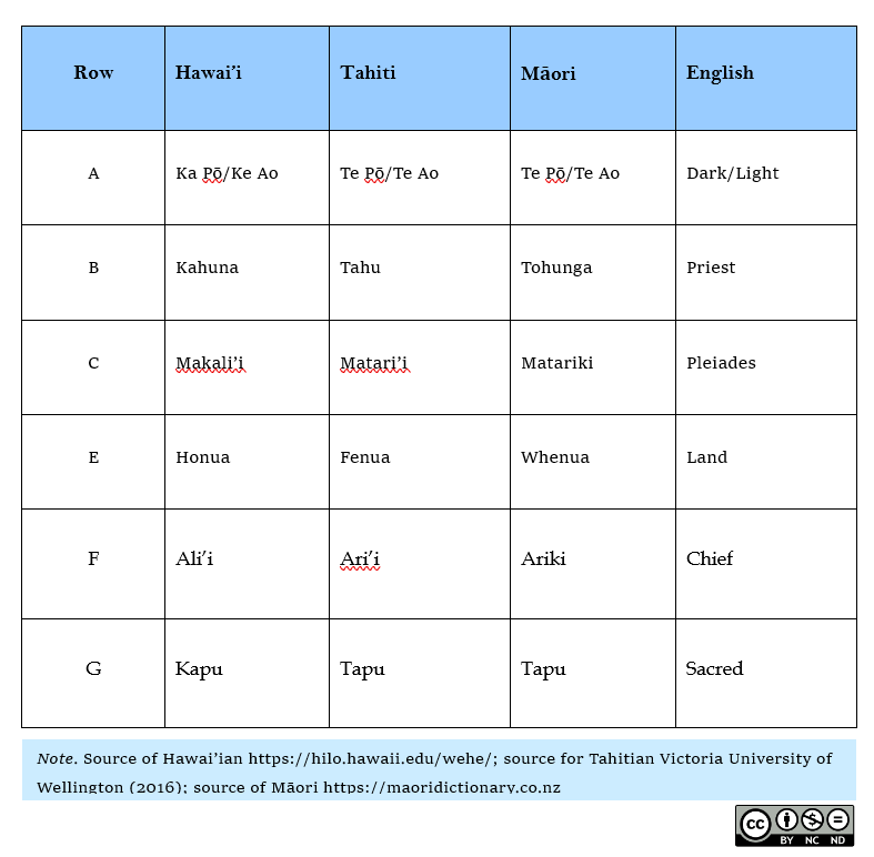 From this chart we can see that there is a striking similarity in the languages of people across Te Moana Nui a Kiwa – from Hawai’i to Aotearoa New Zealand in the south and Tahiti in between.