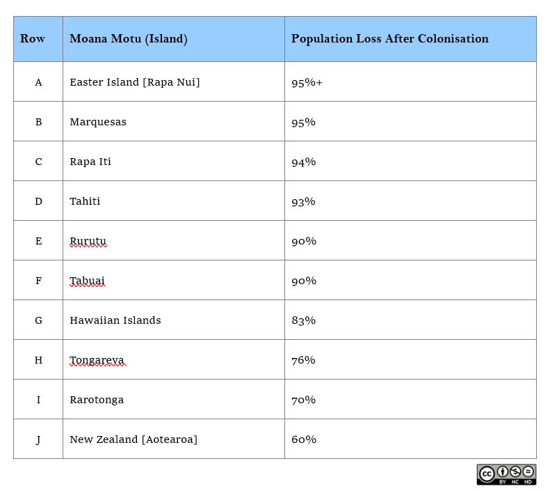 The chart above is the impetus behind the need to decolonise Western academia and where possible, Western society. These statistics reveal the devastating impact of European1 colonisation on the Indigenous Peoples of Te Moana Nui a Kiwa (Pacific Ocean).