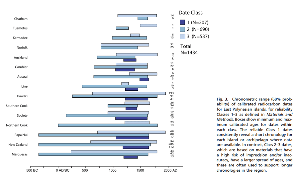Of note is the long tail of Class 3 (middle blue colour) sample. While having a wide standard deviation (i.e. dating is in a range rather than specific) these go back around 300BCE in the Marquesas, Aotearoa New Zealand and Rapa Nui. This means that within around century of this date, someone was lighting fires and eating food at this early time. In my view, this is evidence of early exploration of Te Moana Nui a Kiwa.