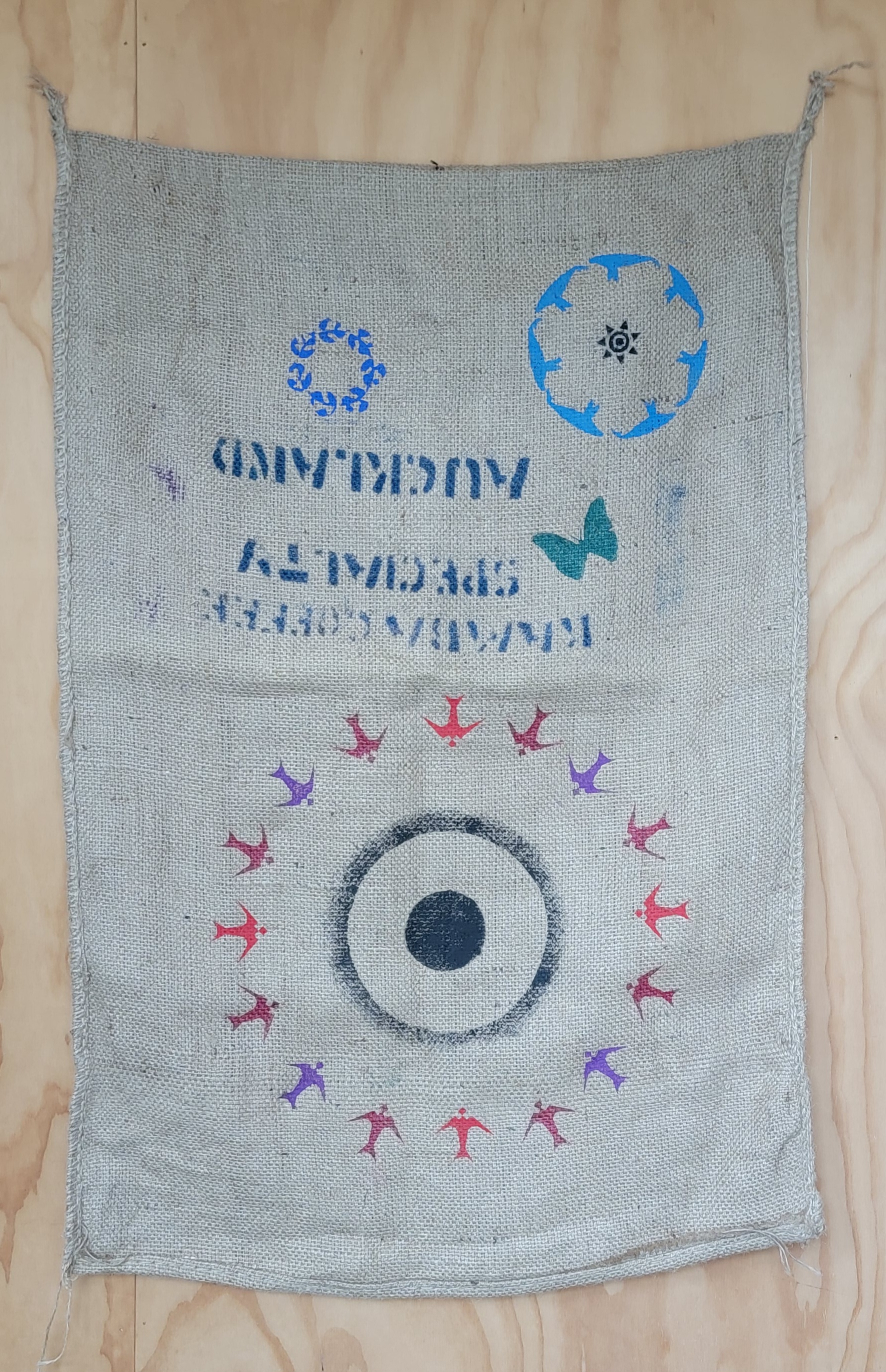 This is a recent work, where I have eliminated a strong focus on electronics, in favour a more balanced approach. I design forms on the computer and use them to create stencils. Then I make plant based paints, and create images such as the one above, on recycled coffee sacks.