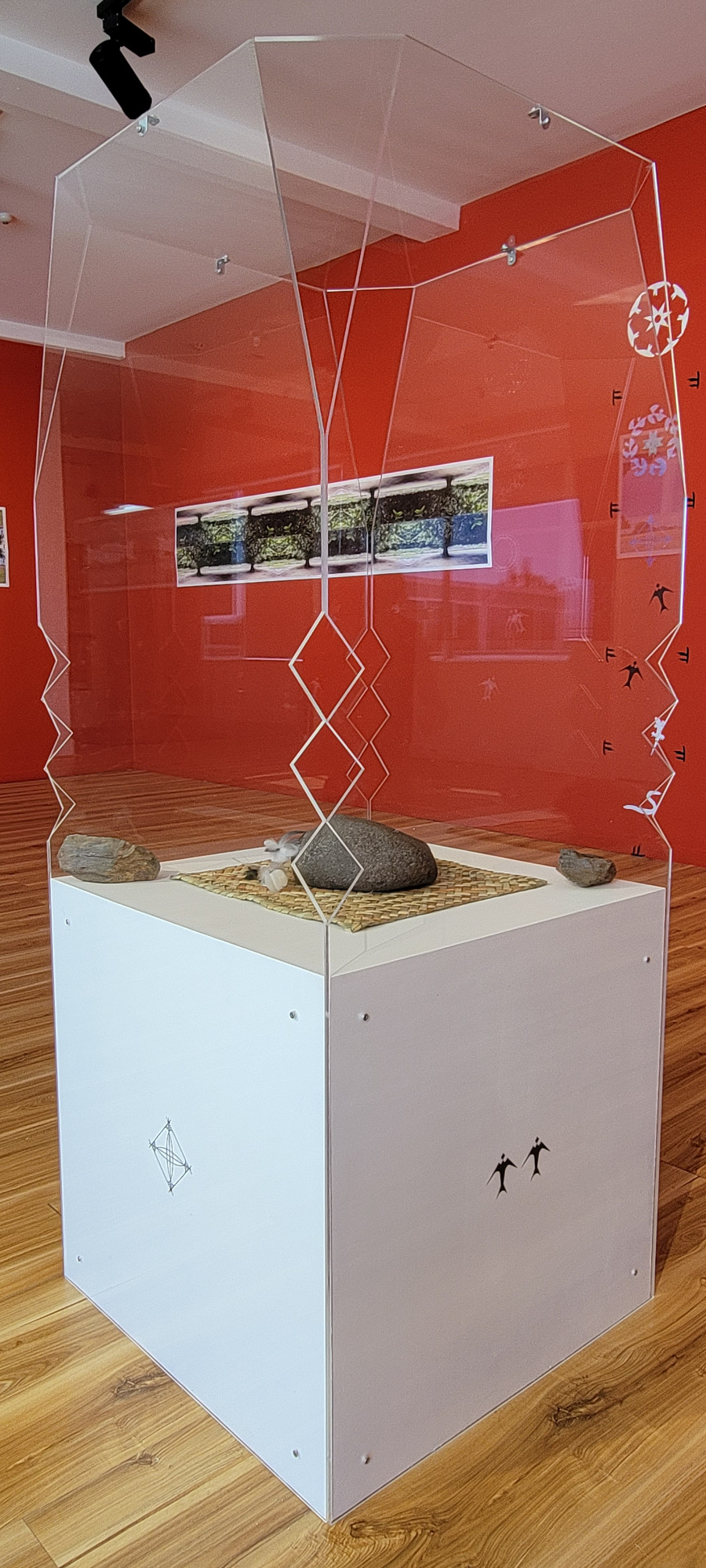 Te Manu Ra’a on a whariki (mat) woven by Kim Kahu. At left is one of two pointer kōhatu, which together point north regardless of the orientation of the plinth. Knowing north was a fundamental piece of knowledge for Moana peoples, an orientation to te taiao, the cosmos.